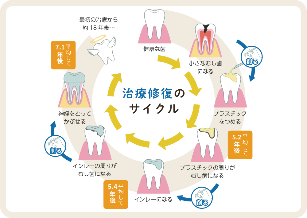 むし歯は一度できると完治せず、治療を繰り返すことで「削る→詰める→再発する」という悪循環、いわゆる「デンタルサイクル」に陥ってしまいます。そうならないためには、むし歯をつくらないことが何より大切です。定期的な検診や予防ケアを通じて、健康な歯を長く守っていきましょう。