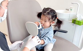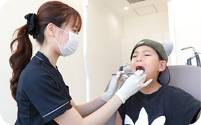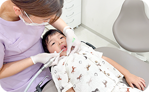 お子様の歯は大人よりもやわらかく、むし歯になりやすい傾向があります。当院では、歯の表面にフッ素を塗布し、歯質を強化する処置を行っています。生えたての歯はフッ素を取り込みやすいため、歯が1本でも生えたらご来院ください。定期的な塗布により、むし歯に負けない丈夫な歯を育てていきます。