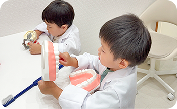 当院では、親子でお口の健康について楽しく学べるよう、さまざまなイベントを開催しています。歯科衛生士による「お口の健康教室」では、正しい歯みがき方法やむし歯予防についてわかりやすくレクチャー。歯科衛生士と管理栄養士が行う「離乳食教室」では、離乳食の進め方や食具の選び方・使い方に加え、発達に合わせた食べ方やおやつの選び方、噛む力を育てるための工夫や正しい姿勢の重要性についても学べます。また、子どもたちに大人気の職業体験や、院長先生による夏休みクイズ大会も実施しています。